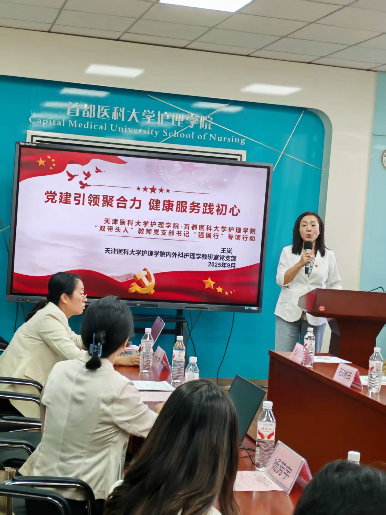 随后,天津医科大学半岛网页版院长臧小英分享了天医半岛网页版的概况、发展沿革和学生培养的宝贵经验,展现了其深厚的办学底蕴和育人成效。在党建与业务深度融合的专题研讨环节,天津医科大学半岛网页版内外科教研室党支部书记王岚与首都医科大学半岛网页版基护学系党支部书记刘溢思,围绕“双带头人”教师党支部书记“强国行”专项行动主题,分别分享了各自支部在强化思想建设、落实价值引领、推动学科发展、投身社会服务等方面的创新实践与显著成效,为双方如何将党建“软实力”转化为发展“硬支撑”提供了有益借鉴。